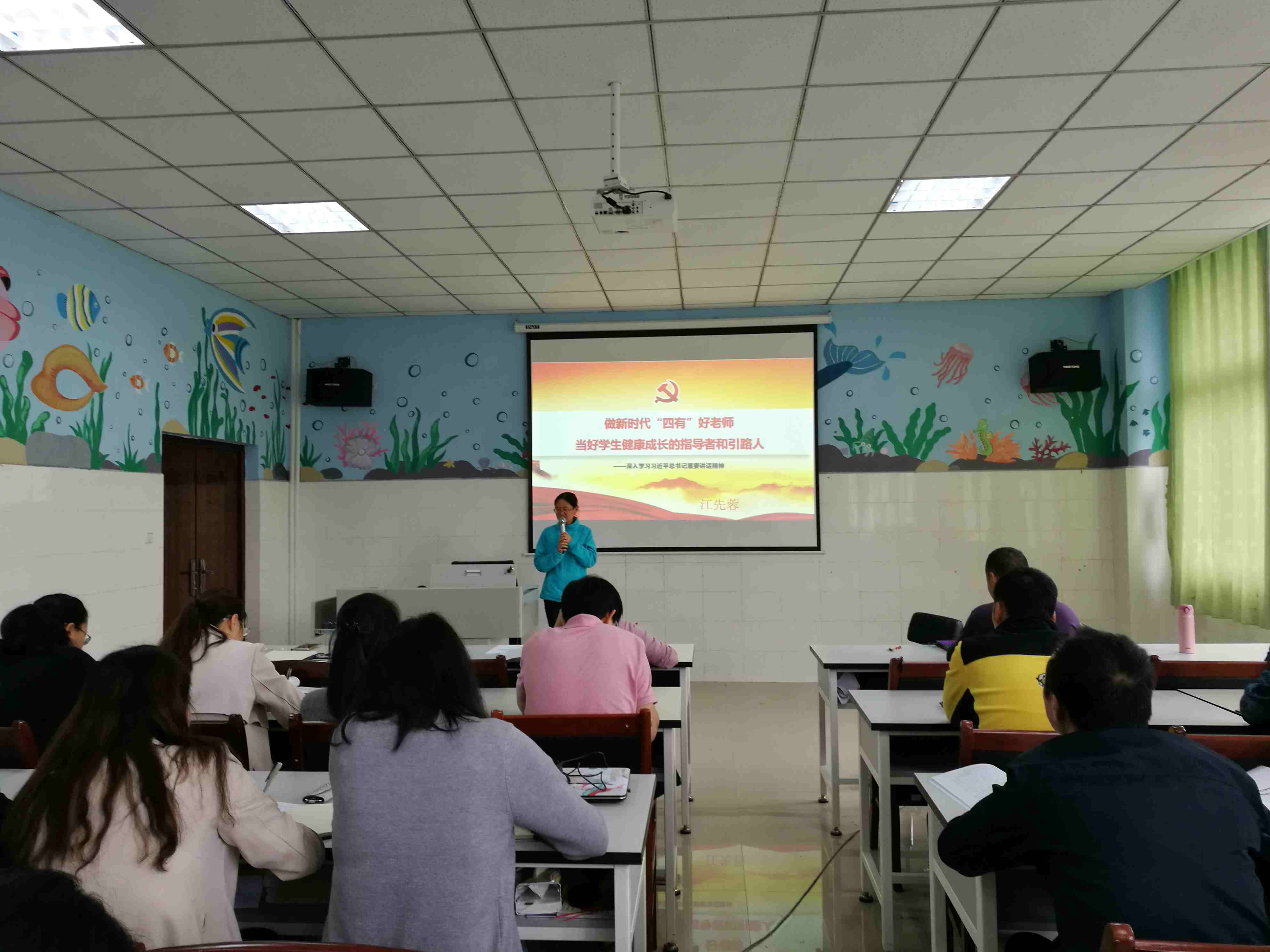 江先蓉书记从“什么是四有好老师”、“为什么要做四有好老师”、“做四有好老师的主要制约因素”、“当好学生健康成长的引路人”四个方面对习近平总书记的重要讲话精神进行了辅导解读。