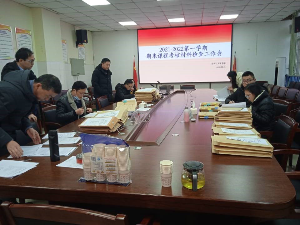 【本网讯】根据迎接本科教学工作合格评估安排和教务处“关于开展2021-2022学年第一学期期末试卷检查工作通知”的相关要求,2月23日上午9点,由向武校长为组长,刘卫星处长为副组长,向昌成、罗南超、龚华明、赵康利、付红霞、刘艳雯等老师组成的试卷检查小组,对资源与环境学院2021-2022-1学期的全部考试、考查课程期末资料组档情况进行了检查。资源与环境学院余列,王丽华,侯雨乐,刘蓉、何红艳、李懿、胡尧、苏柯、张亚平、何乾瑞等老师参加本次检查。