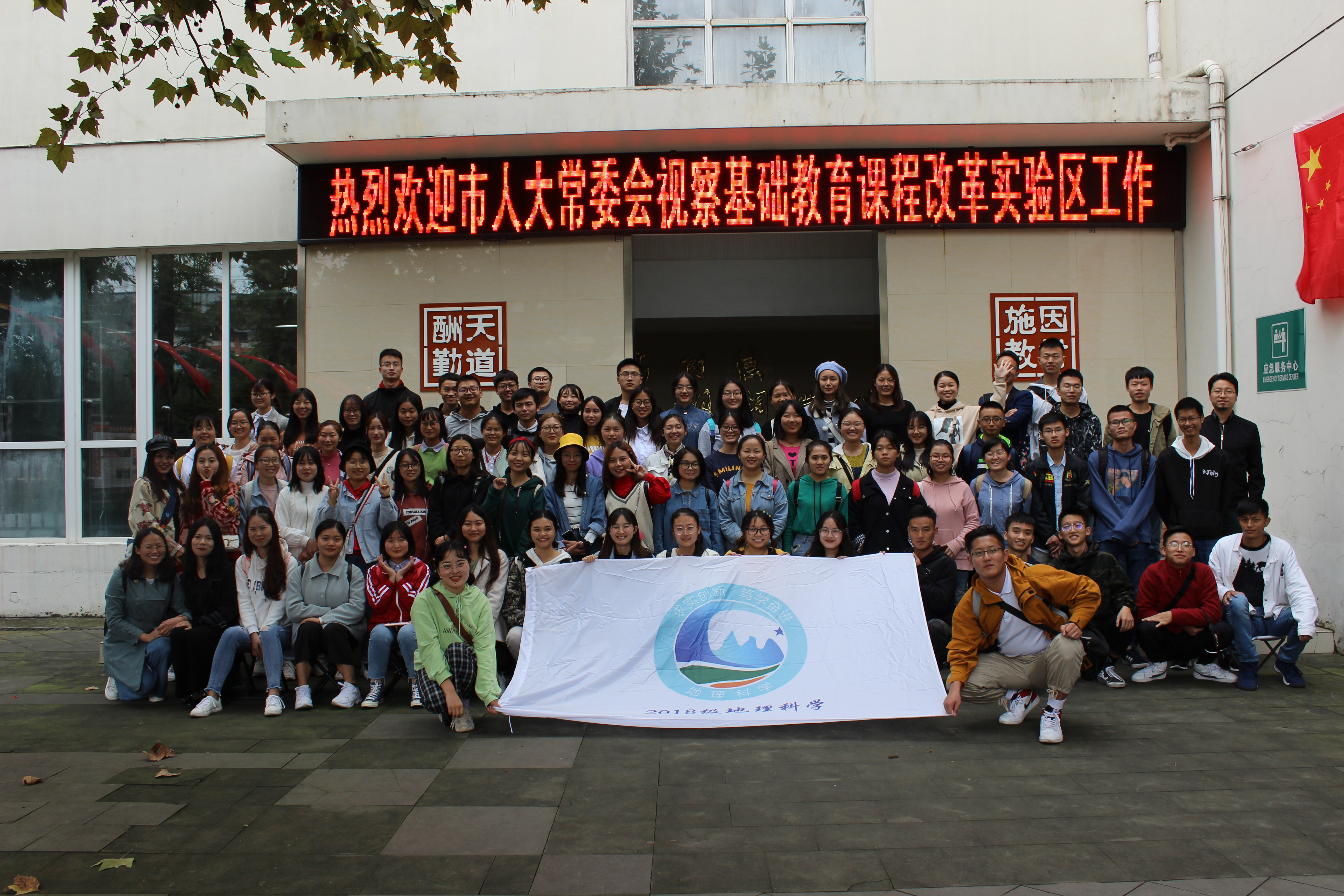 【本网讯】为增强地理科学本科专业学生专业认知、提高师范技能。根据资源与环境学院2018版地理科学本科专业人才培养方案,按照学校统一要求,结合我院地理科学本科专业教学实际。10月22日上午8点在胡尧老师和杨宗英老师的组织下2018级地理科学的全班同学前往都江堰塔子坝中学进行见习。