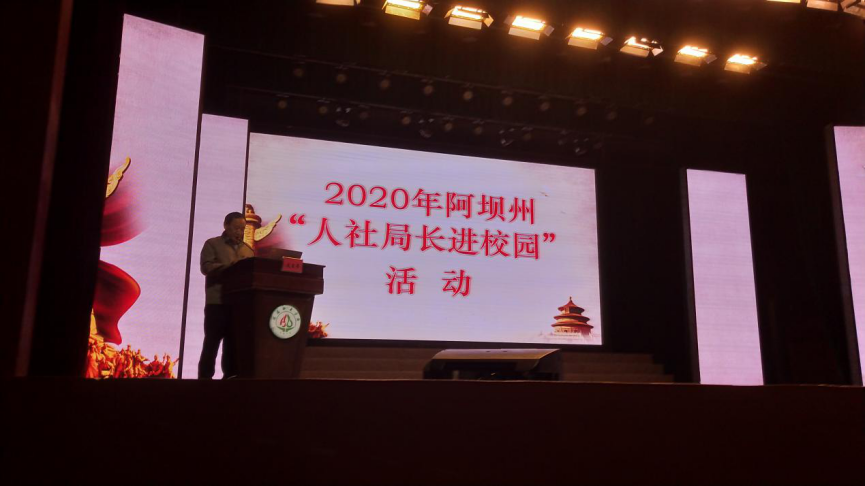 【本网讯】“一业为主,多元发展”。为帮助我校毕业生认清就业形势,转变就业观念,引导和鼓励大学生自主创业,9月25日上午十点整,我校在南苑剧场顺利召开了“阿坝州人社局长进校园”活动。出席本次讲座的有:阿坝州人社局党组成员、副局长宋拉扎西、阿坝州人力资源服务中心主任祁忠山、成都市就业促进会会长陈帅、成都市就业局指导专家张婧竹、阿坝州州县相关单位的领导和工作人员、我校副校长甲任教授、各二级学院党总书记、就业干事和毕业班的部分学生。此次活动由我校学工部副部长杨友国主持。