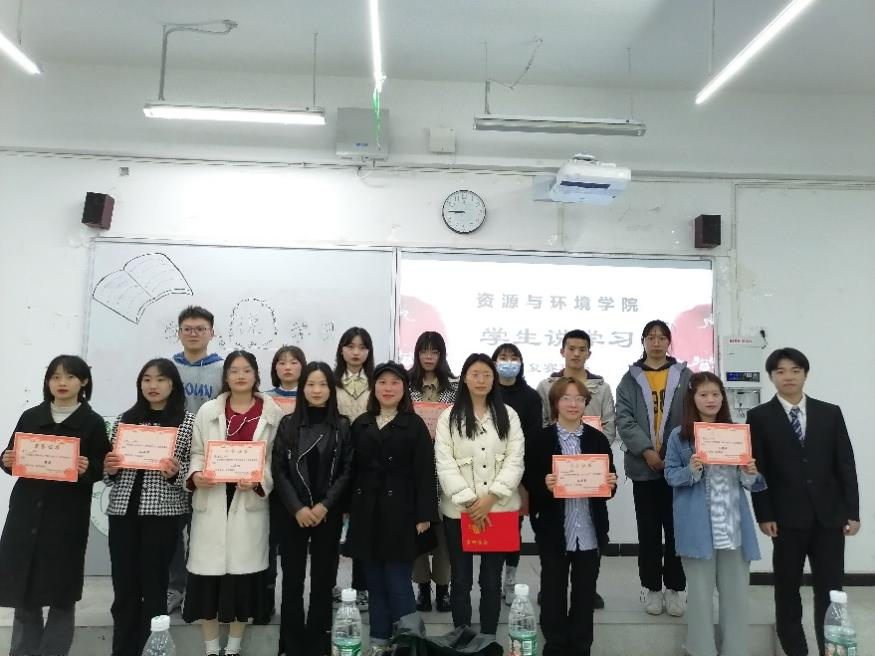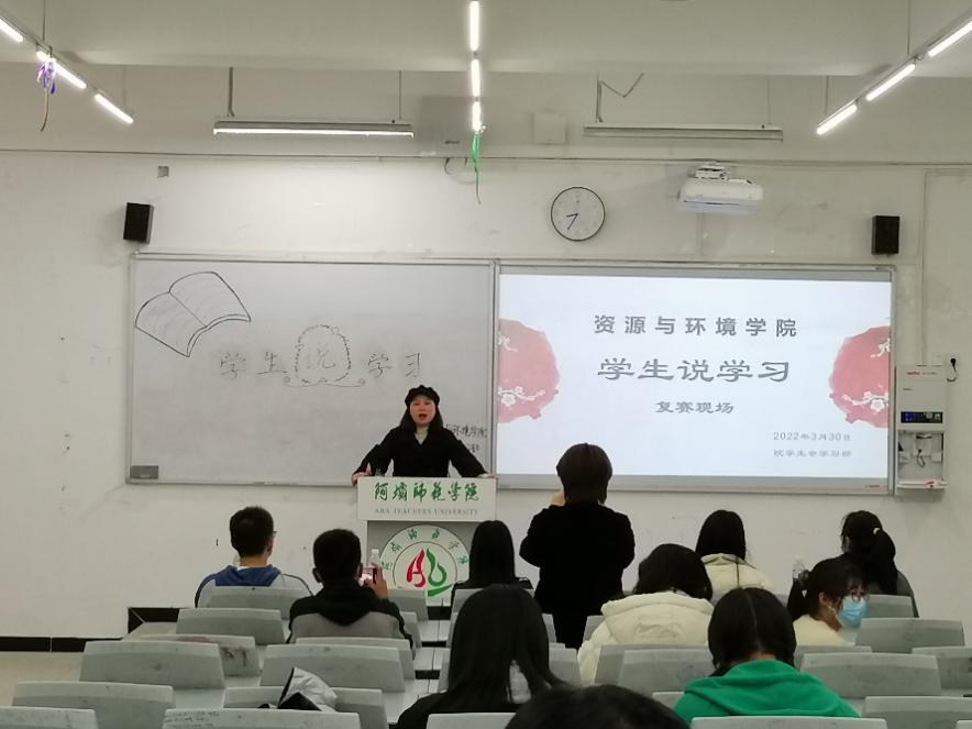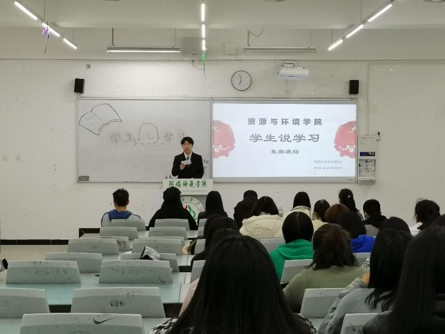 【本网讯】为增强同学们自觉学习的意识、营造良好的学习氛围、在校园里形成爱学、善学、勤学的风尚,资源与环境学院于2022年3月30日下午18时50分在树人楼C103举办了“学生说学习”决赛。此次决赛在党总支副书记余列的指导下,由我院学生工作办公室刘文超、王艳蓉、何婷老师组织全院各班级开展。余列书记、王丽华院长、王艳蓉老师、何婷老师、以及主席团余凡同学、学生代表向君豪同学担任此次决赛的评委。杨柯辰同学主持本次决赛。