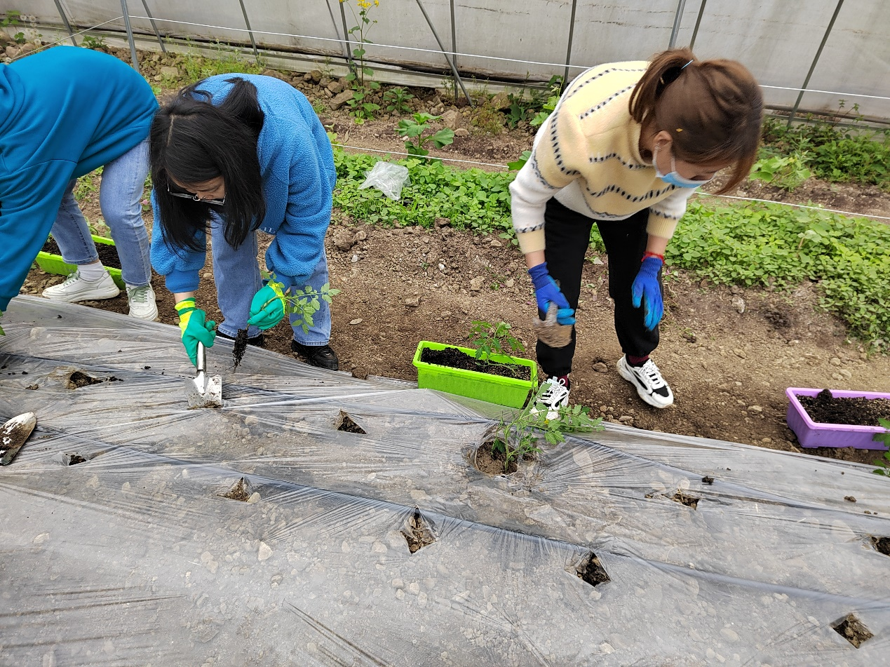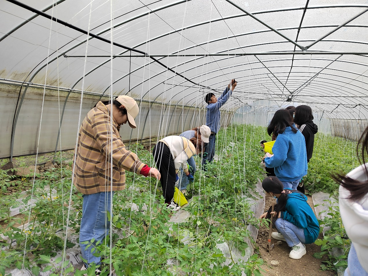 参加活动的学生7:50在校门口集合后前往黑土坡智慧农业科创园,由张老师带领志愿者进入温室大棚并介绍现代写作业种植技术。随后,张老师演示翻土和讲解栽种番茄苗细节并再让志愿者实际操作,土地平整规划番茄苗也井然有序。直到给番茄吊完秧上午的任务完成,清点过人数后返回学校