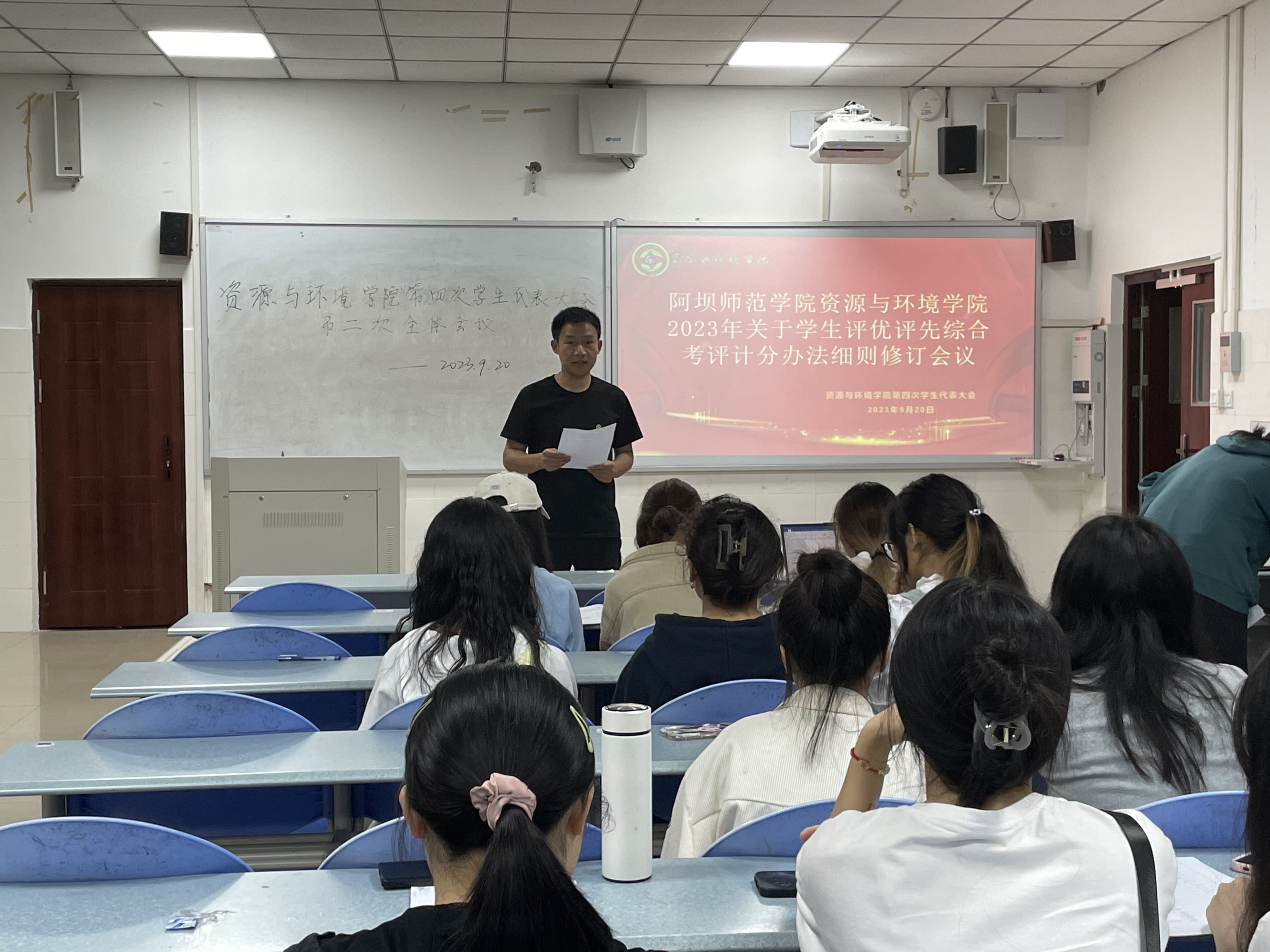 【本网讯】为了更好地落实教书育人,促进学生全面发展,深挖学习、生活、工作等方面的优秀典型,树立榜样力量,促进学院学风建设走深走实,2023年9月20日下午5时我院在实验楼A314教室举行“资源与环境学院第四次学生代表大会第二次全体会议”,审议《资源与环境学院学生评优评先综合考评计分办法细则》的修定。学生工作办公室刘文超、班玛吉老师出席。学院学生会主席团蓝慧林、30名正式学生代表参加会议。会议由蓝慧林主持。