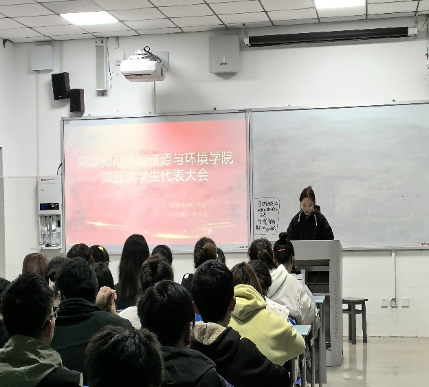 【本网讯】2023年10月18日下午6点10分我院于实验楼A315举行资源与环境学院第五次学生代表大会。学院党委副书记余列、学生工作办公室副主任刘文超、学生会主席蓝慧林、蒲佳和分团委学生副书记吉木莫日洛、陈阿甲、王树以及全体52名学生代表参加会议。