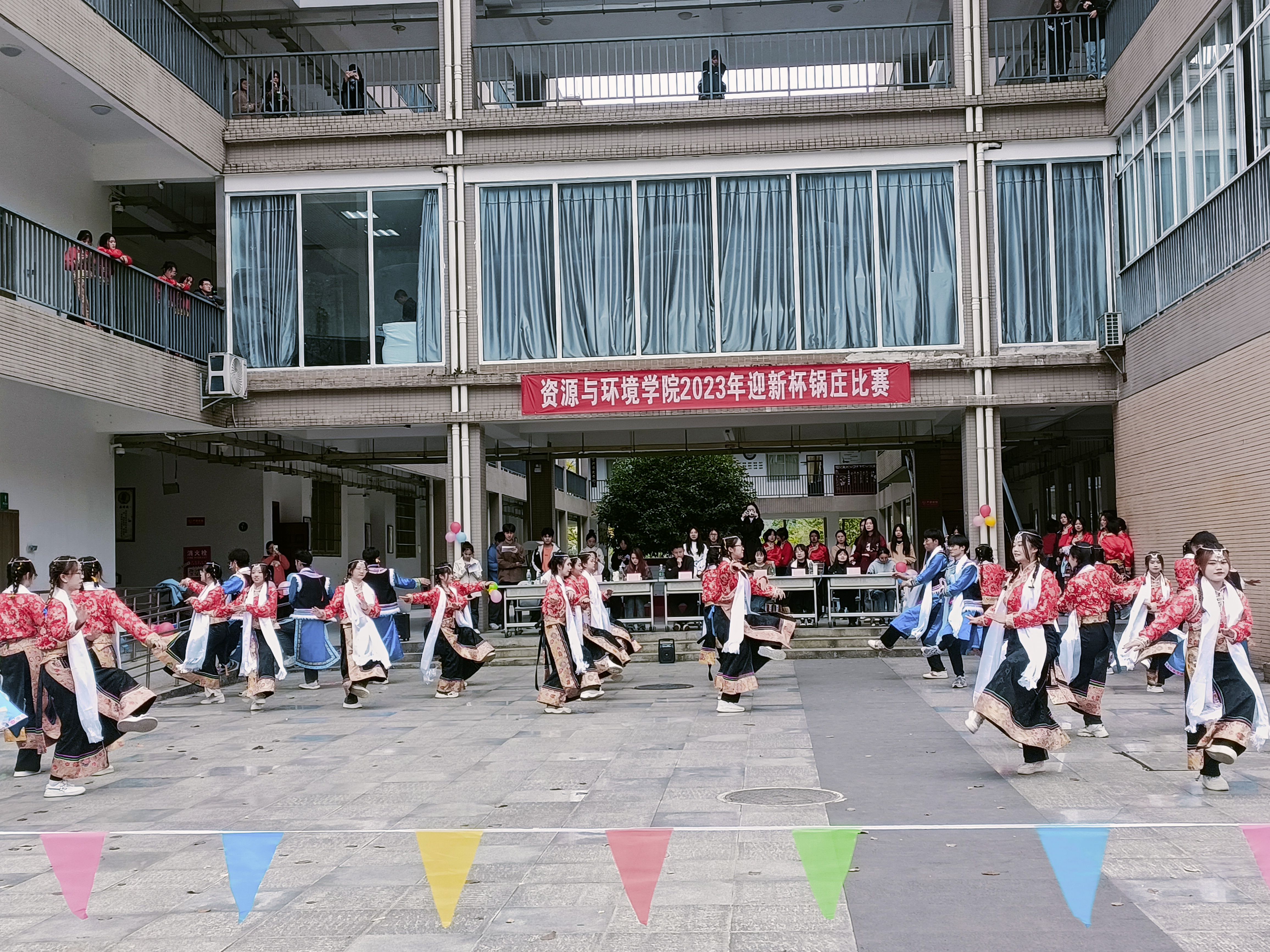 【本网讯】宁静的午后时光,伴着和煦的阳光。2023年11月8日下午3点,我院在树人楼A、B栋之间的广场上举行“资源与环境学院2023年迎新杯锅庄比赛”。出席比赛的评委是资源与环境学院党委副书记、副院长王丽华老师、资源与环境学院团委书记刘文超老师,辅导员何婷老师、2023级生物科学专业班主任谭玲老师、2023级地理科学专业班主任刘艳梅老师、院学生会文体部部长何思燃、院团委组织部部长李心柔、院学生会主席唐兰。比赛由罗艳逢、赵民喻同学主持。