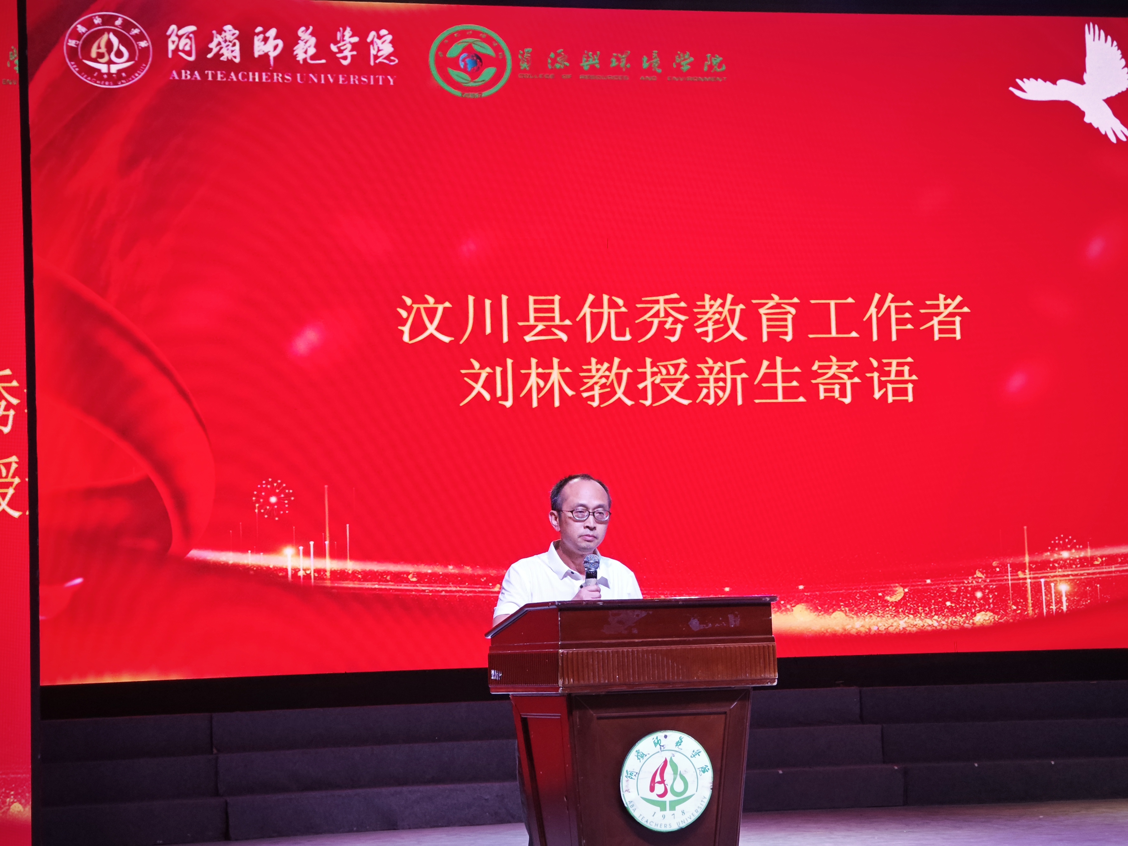 最后,汶川县优秀教师获得者、化学教研室刘林教授寄语新同学们。他首先向新同学们表示了热烈的欢迎,他谆谆教导同学们,要尽快适应学校校园环境,适应人际关系环境,适应大学学习环境,尽快融入其中,找到自己的学习方法,沉下心来把专业知识学习好,为未来的人生发展奠定坚实的知识基础。