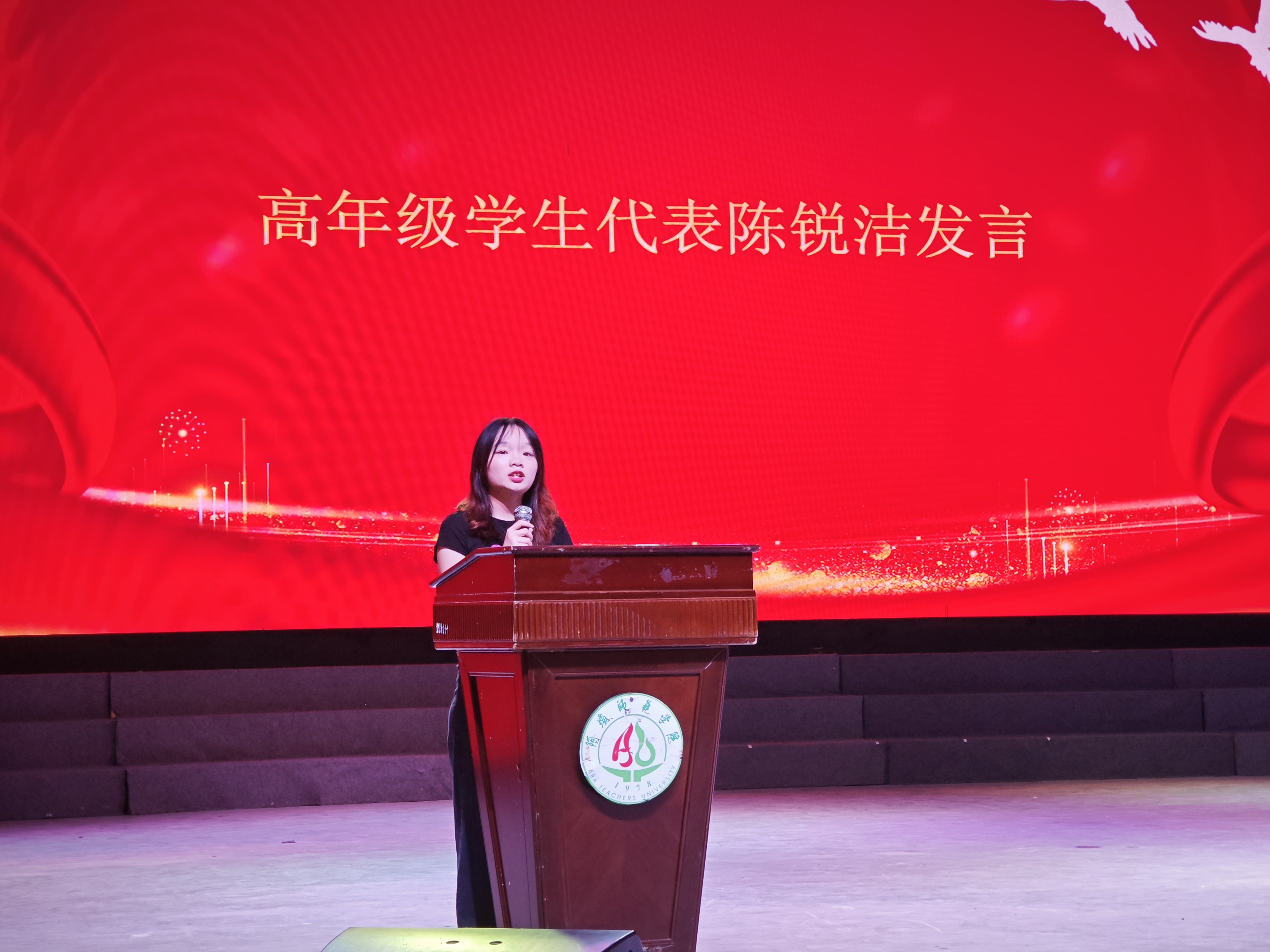 之后,高年级学生代表来自2022级化学专业的陈锐洁同学发言,她讲到自己两年大学时光的奋斗历程,回忆了那一幕幕埋头学习、突破自我、化学竞赛的场景,同时向新同学们分享自己的经验,凡事预则立,不预则废,温馨提示学弟学妹们提早谋划,脚踏实地多做实事,少做空想。
