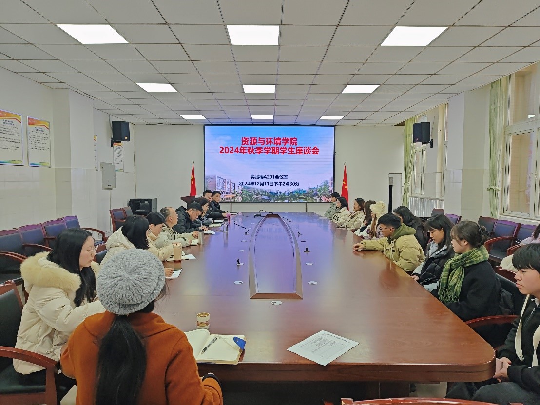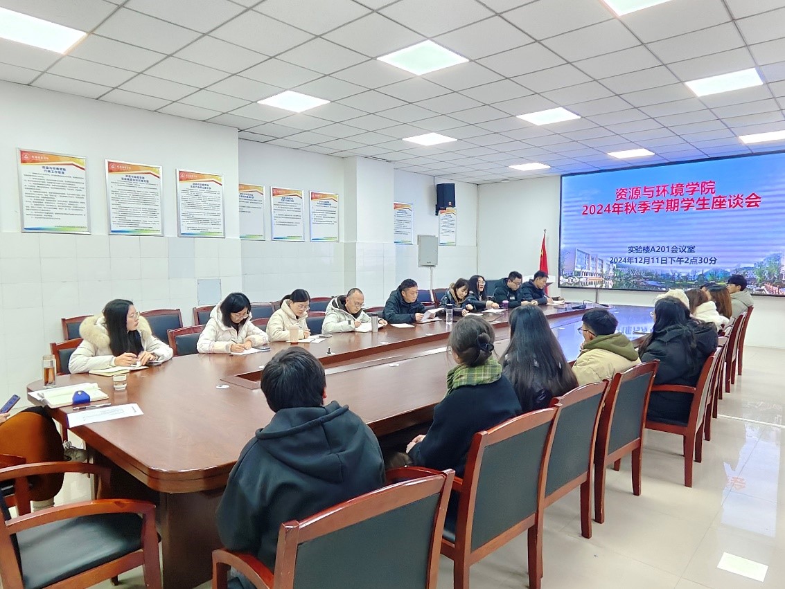 【本网讯】为进一步深入了解我院各年级学生的学习、生活情况,落实以学生为中心的理念,2024年12月11日下午资源与环境学院在实验楼201会议室召开2024年秋季学期学生座谈会。学校正处级专职督导郑文瑜教授、学院党委书记余列、院长王丽华、副院长冯琳、廖光萍教学督导刘林教授、实验室主任王仕英、学生工作办公室副主任刘文超、党政办公室主任曾淼、教学科研办公室苏柯、辅导员何婷老师出席座谈会。会议由余列书记主持。