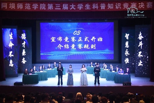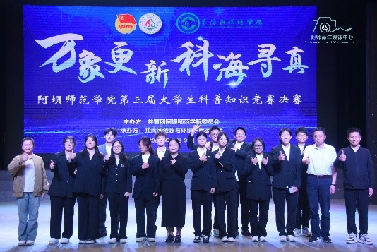 【本网讯】为营造浓厚的校园科普文化氛围,激发我校大学生科学探索精神,阿坝师范学院第三届大学生科普知识竞赛决赛于2025年5月9日晚上7:00在南苑剧场成功举办。竞赛主题是“万象更新科海寻真”,各二级学院选送了九支参赛队伍参加校级决赛,资源与环境学院党委书记余列、物理与电子电气工程学院团委书记赵雪莲、资源与环境学院团委书记刘文超莅临现场。本次比赛由资源与环境学院苏天琦、曹卉欣、曾昱喆、经济与管理学院何鑫泉同学主持。