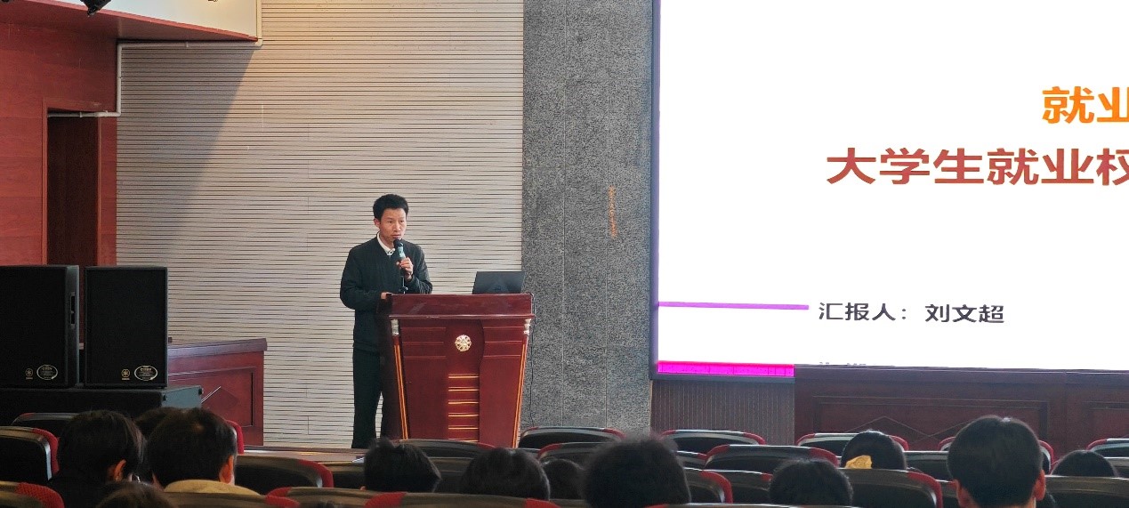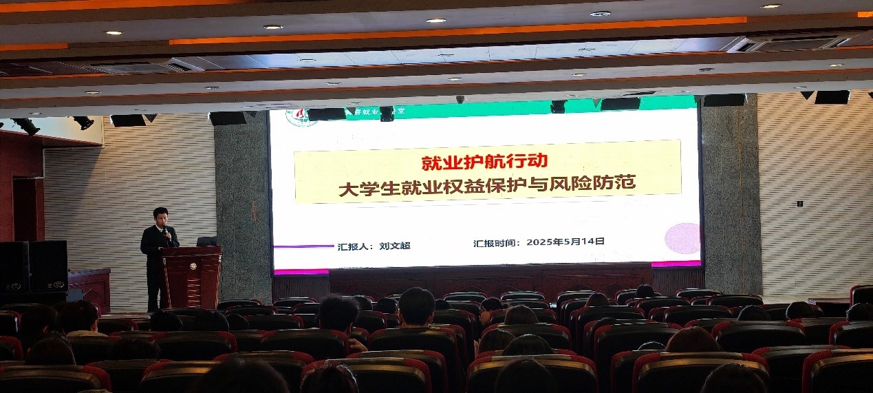 【本网讯】为了增强我校学生就业安全意识,强化学生的就业权益保护能力,防范化解各类就业风险,助力同学们从容应对复杂就业形势,我校就业创业指导中心组织全校就业工作一线老师们精心设计了一系列就业技能强化讲座,本讲座是第五讲。5月14日晚上7点,资源与环境学院学生工作办公室副主任、就业干事刘文超于图书馆学术报告厅开展“大学生就业权益保护与风险防范”专题讲座。全校各二级学院200余名学生到场聆听,共同汲取就业护航知识。