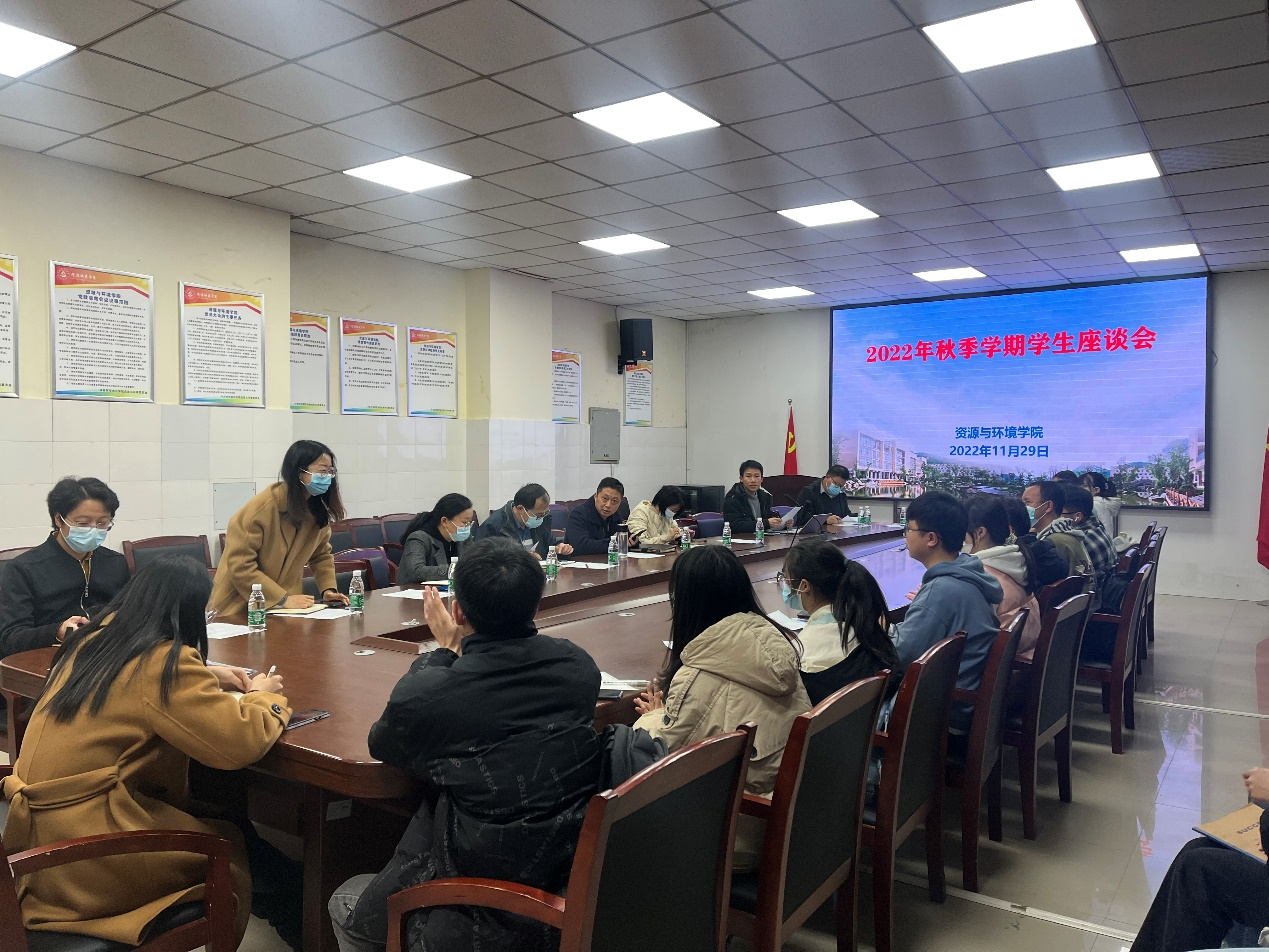 【本网讯】为了更好地促进我院教学工作、管理服务、学风建设、疫情防控等工作有序开展,更好地服务学院师生,11月29日下午7点,“资源与环境学院2022年秋季学期学生座谈会”在实验楼201会议室举行。学院党委副书记余列、学院党委副书记、副院长王丽华、学院副院长侯雨乐、生物教研室主任李懿、地理科学教研室主任胡尧、化学教研室主任何红艳、学院教学督导委员刘林、崔娜娜、教学科研办公室主任刘蓉、实验室主任王仕英、学生工作办公室副主任刘文超、辅导员王艳蓉、班玛吉、何婷出席会议,各位领导、老师们跟学院各班级学生代表齐聚一堂,对院教学工作、管理服务、学风建设、疫情防控等工作进行了座谈交流。会议由刘文超老师主持。