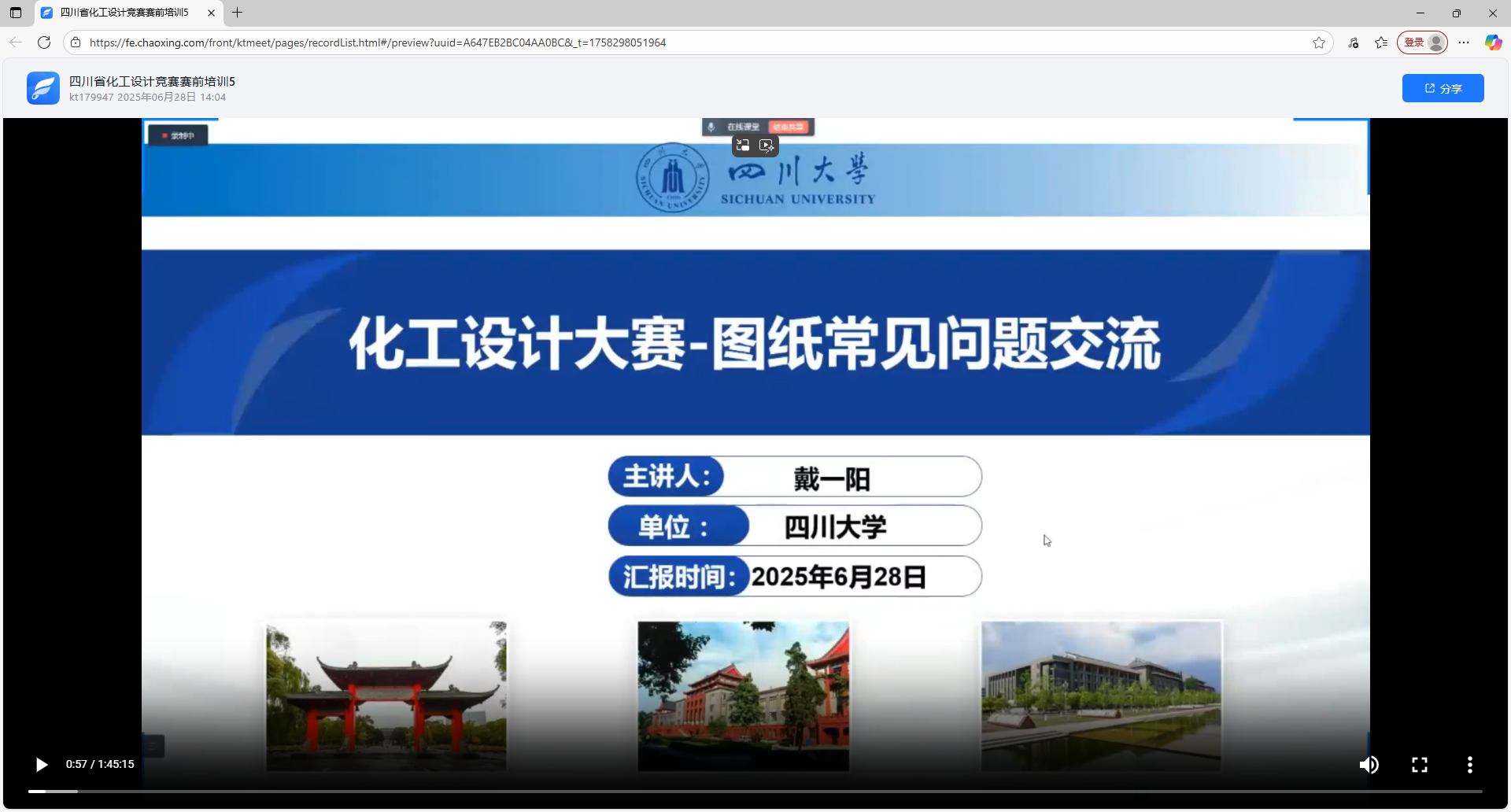 【本网讯】为进一步强化各参赛队伍对工程赛道评审标准的理解,提升项目设计的专业性与竞争力,由我校继续组织对全省参赛高校学生的2025年四川省化工设计竞赛第二期赛前培训于6月28日通过线上平台顺利开展。本次培训延续首期的高质量内容与高参与度,特邀西南石油大学、四川大学两位资深专家,分别围绕工程赛道中的现代设计方法与工艺图纸评审要点进行系统讲解,为参赛师生提供了及时、精准的备赛支持。