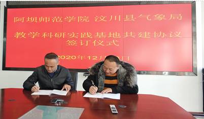 本着“资源共享、互惠双赢、共同发展”的原则,2020年12月8日上午,资源与环境学院副院长杨子松一行5人前往汶川县气象局洽谈合作。洽谈会上,双方就今后科研团队的创建、科研课题的合作、学生实践学习等方面进行了深入交流,签订了阿坝师范学院教学科研实践基地共建协议。会后,双方举行了阿坝师范学院教学科研实践基地授牌仪式。汶川县气象局局长邓明放、副局长曾德科、台长杨龙等参加了有关活动。