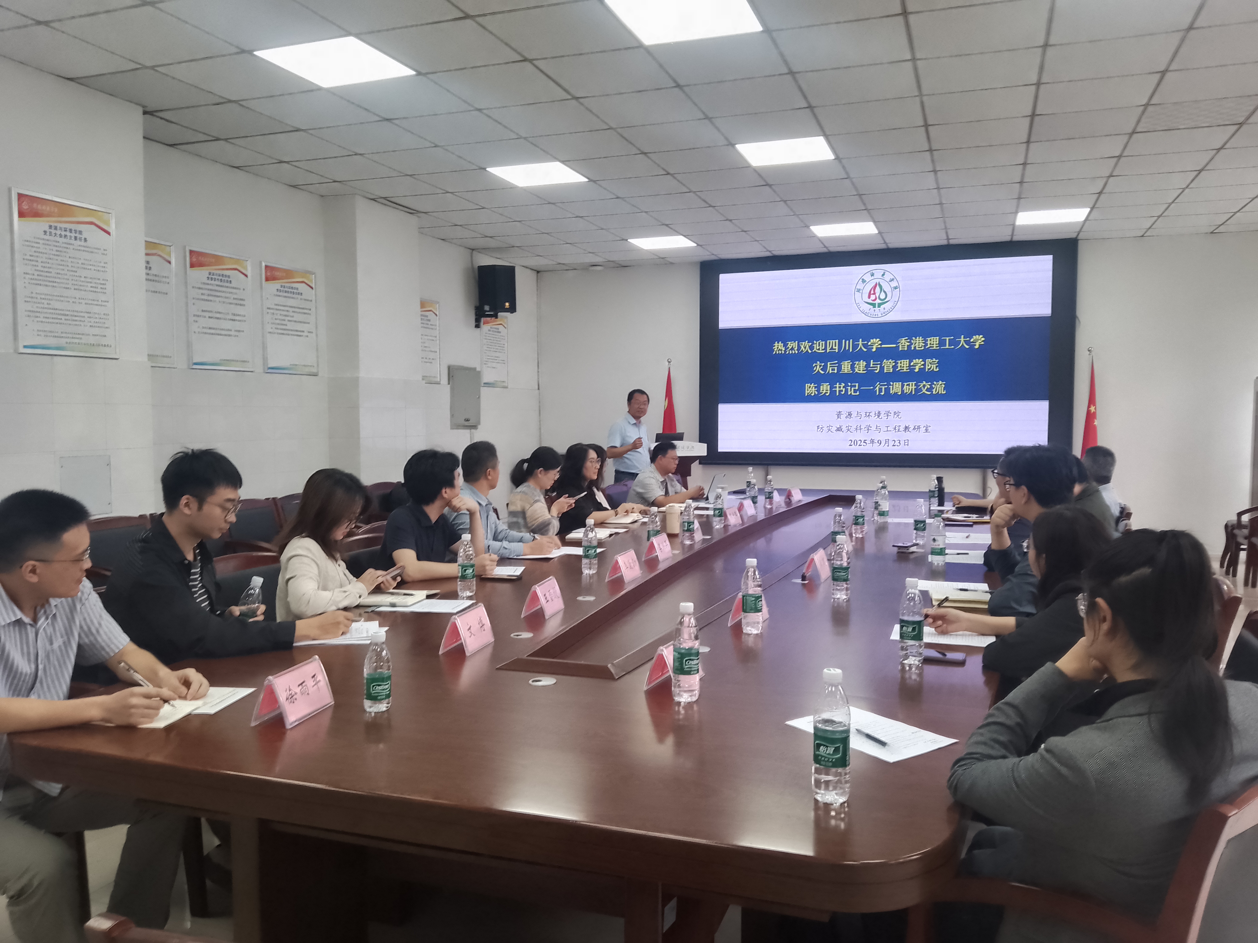 【本网讯】9月23日,四川大学灾后重建与管理学院党总支书记陈勇携副院长卢毅教授等一行到我校资源与环境学院调研交流。资环学院副院长冯琳主持会议,我院防灾减灾科学与工程教研室全体教师列席。
