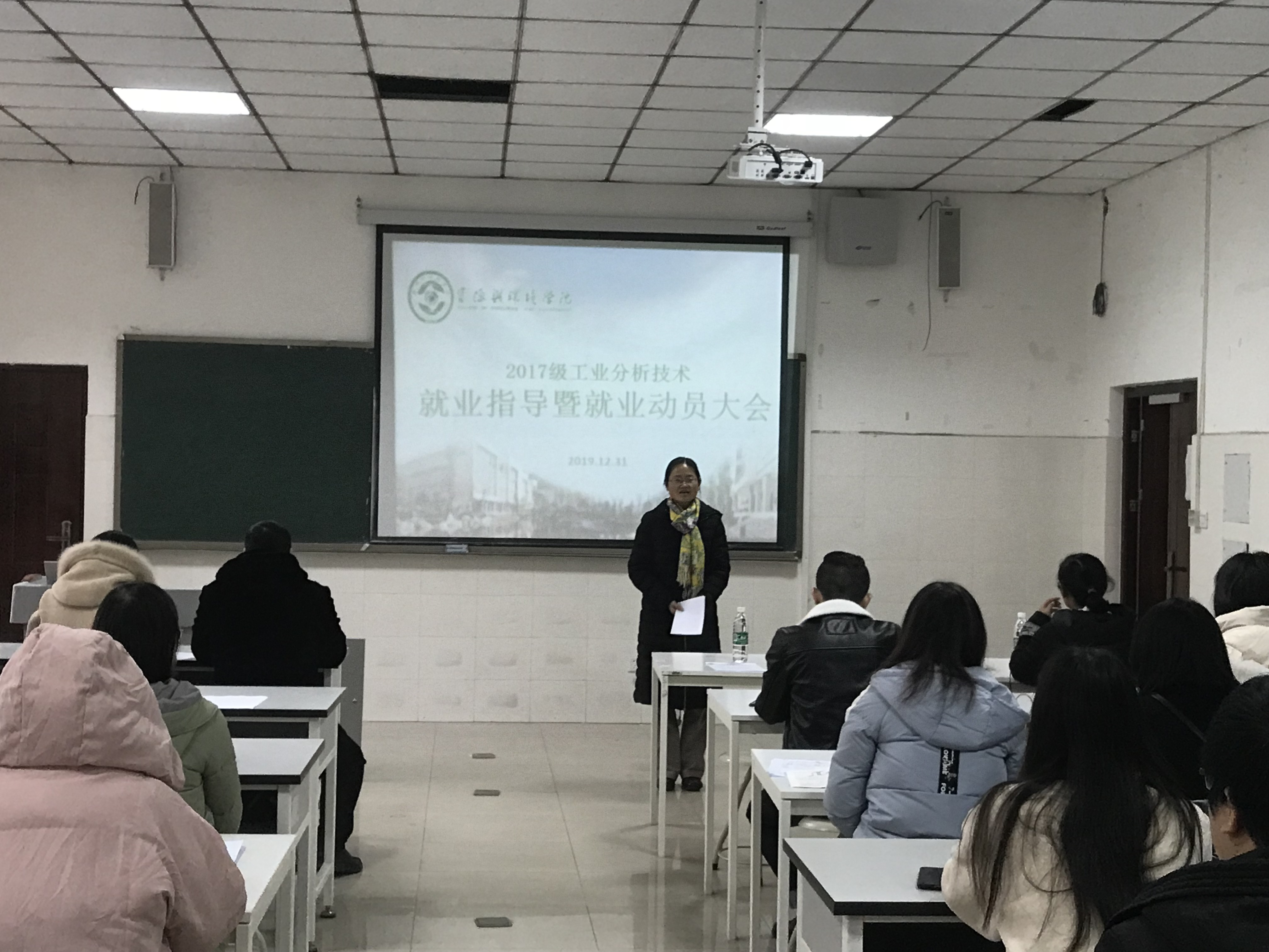 【本网讯】2019年12月31日10:00,我院2017级工业分析技术班在树人楼A312开展毕业生就业指导暨动员大会,我院党总支书记江先蓉、院长杨子松、化学教研室主任任朝琴、2017级工业分析技术班党员联系老师王仕英、以及2017级工业分析技术班班主任杨飞琰和2017级工业分析技术班全体同学参加此次大会,会议由班级团支书李富森主持。
