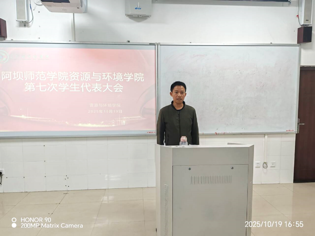 【本网讯】2025年10月19日下午16点整,共青团阿坝师范学院资源与环境学院第七次学生代表大会在实验楼A314教室隆重举行。资源与环境学院分团委书记刘文超老师出席大会,来自各年级71名正式学生代表参加。